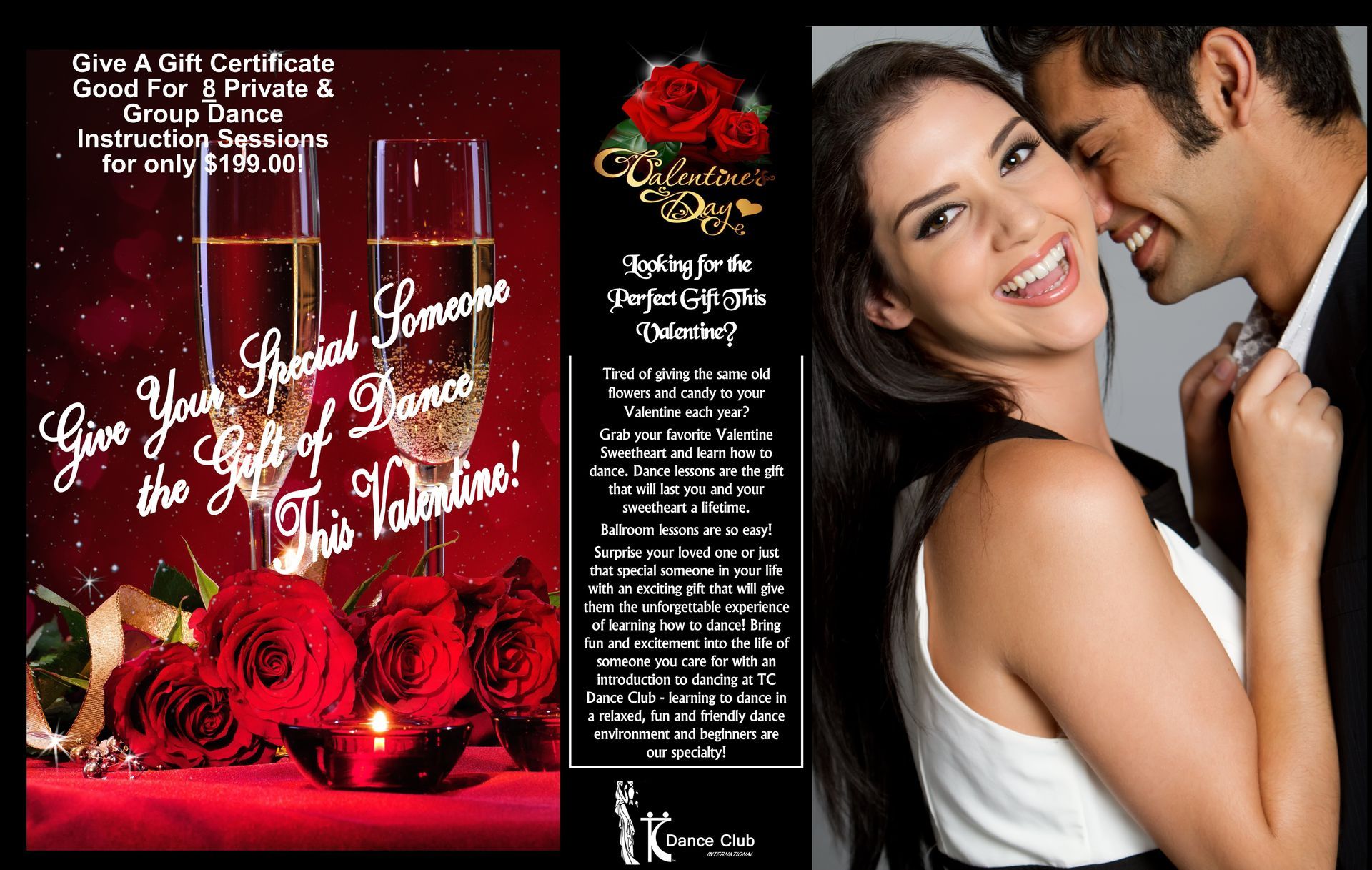 Our gift certificates for Dance Lessons make the perfect Valentine gift. Surprise your loved one or that special someone in your life with an exciting gift that will give them the unforgettable experience of learning how to dance! Bring fun and excitement into the life of a friend with an introduction to dancing at TC Dance Club. Dance Lessons are great for Valentine’s Day Gifts, it’s the gift that truly keeps on giving as they meet new people, make new friends, and get involved in a year‑round whirl of happy people, dance parties and good times. As a bonus, ballroom dancing lessons are not only fun, but also great exercise for anyone!