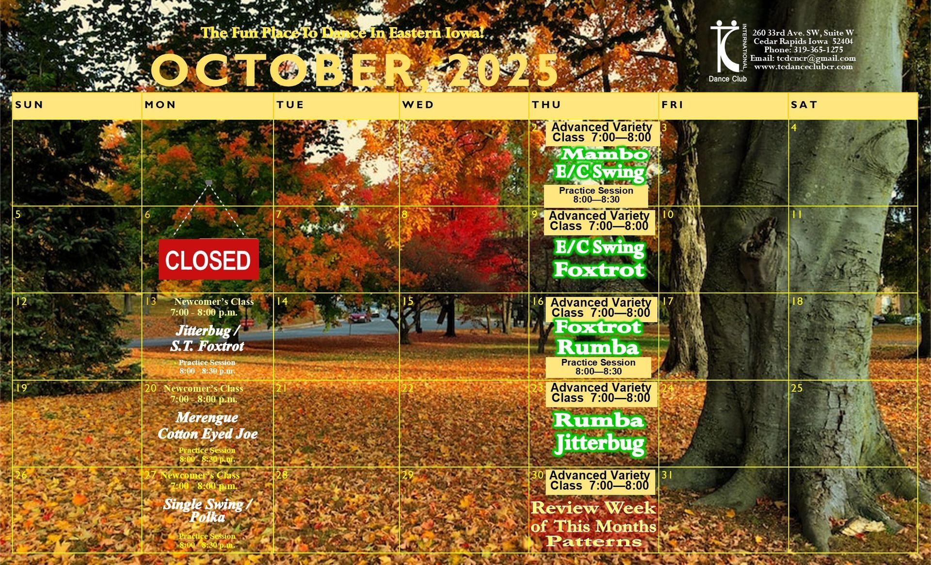 Below is the calendar of events for our Cedar Rapids Iowa TC Dance Club. We have weekly group classes and dance opportunities available for our students, and we would love for you to be a part of them. If you would like to join in with any of these fun dance events here at TC Dance Club, contact us and find out how you can. Please take a look at our calendar to see what is on the menu for this month. Click the calendar to download a copy.